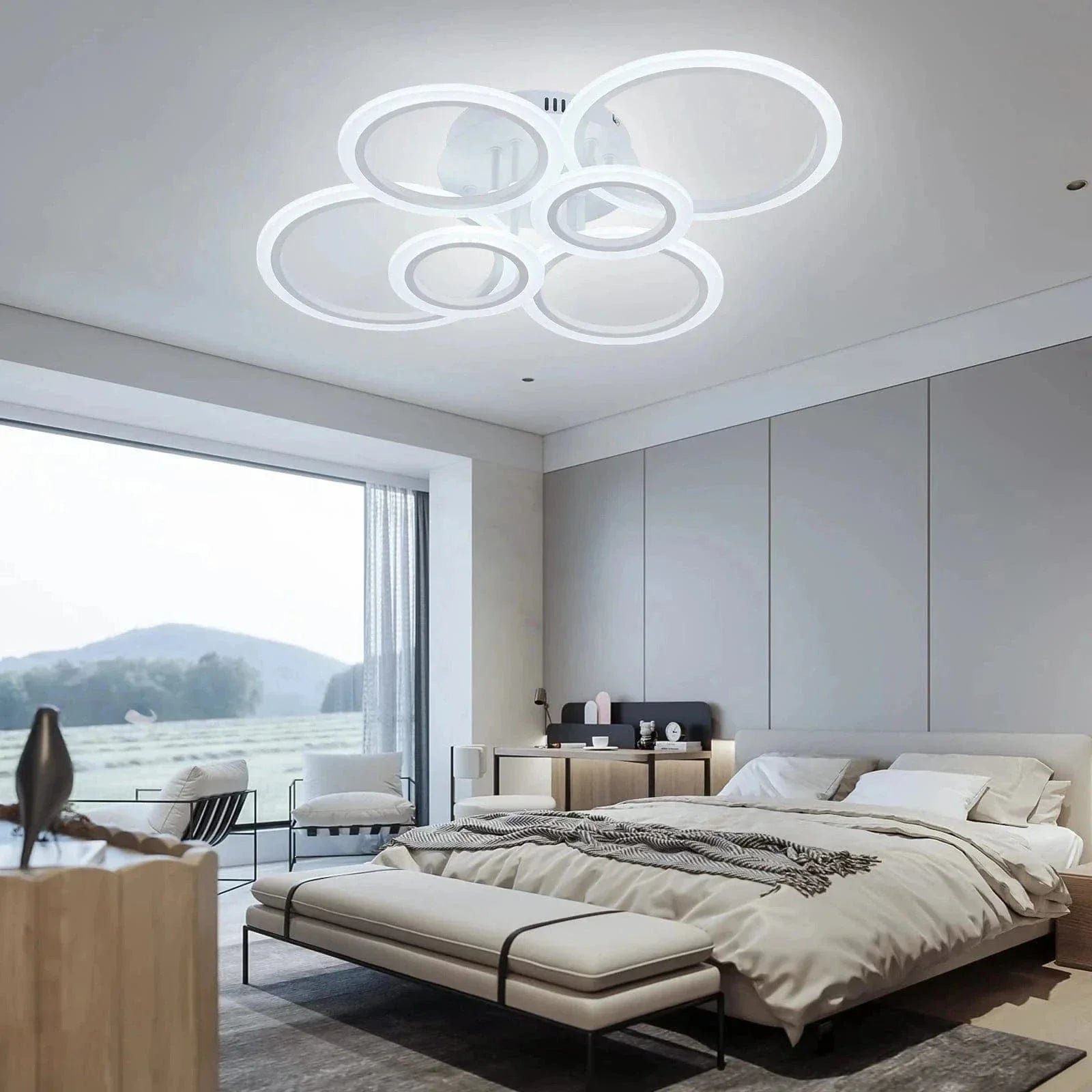 Denne elegante loftlampe i messing kombinerer moderne design med smart teknologi. Med sine cirkelformede LED-ringe skaber den en jævn og behagelig belysning, som kan justeres efter behov. Lampen styres nemt med en fjernbetjening eller via en mobilapp, hvilket gør det muligt at ændre lysstyrke og farvetemperatur for at skabe den rette stemning. Den høj kvalitets messingfinish giver et luksuriøst og stilrent udseende, som passer perfekt ind i soveværelset, stuen eller spisestuen.