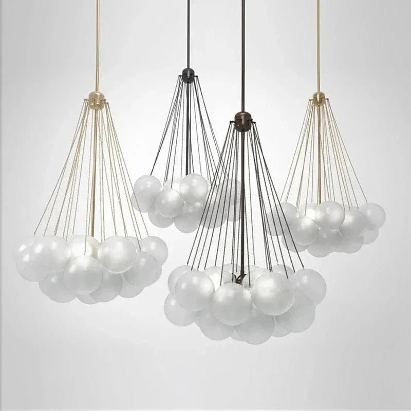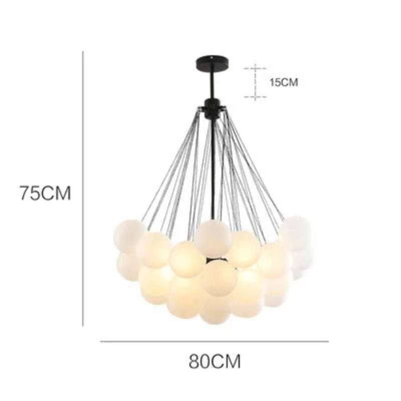 Denne designede loftlampe er virkelig iøjnefaldende med dens elegante glaskupler og unikke ophæng. Lampen kombinerer moderne minimalisme med en legende form, hvilket gør den perfekt til at skabe en sofistikeret atmosfære i stuen, spisestuen eller entréen. Den spreder et behageligt og jævnt lys, hvilket gør rummet varmt og indbydende.