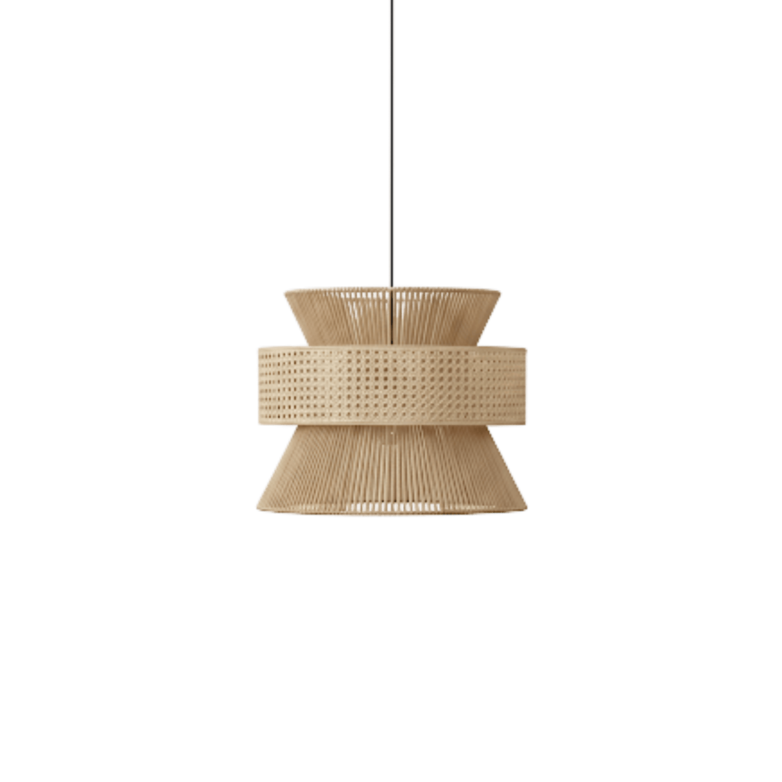 Denne naturlige bambuslampe skaber en varm og indbydende atmosfære i hjemmet. Den skulpturelle form kombinerer vertikale bambuspinde med et bredere, perforeret bånd, der giver struktur og variation i lysstrømmen. Perfekt til nordiske hjem, hvor naturlige materialer er i fokus. Lampens organiske udtryk passer både til moderne, bohemske og japansk-inspirerede indretninger. Hæng den over spisebordet, i stuen eller soveværelset for en stilfuld og afslappet stemning.