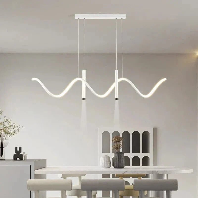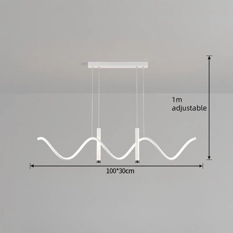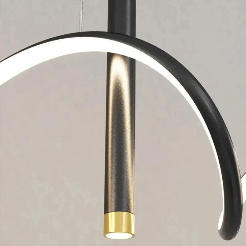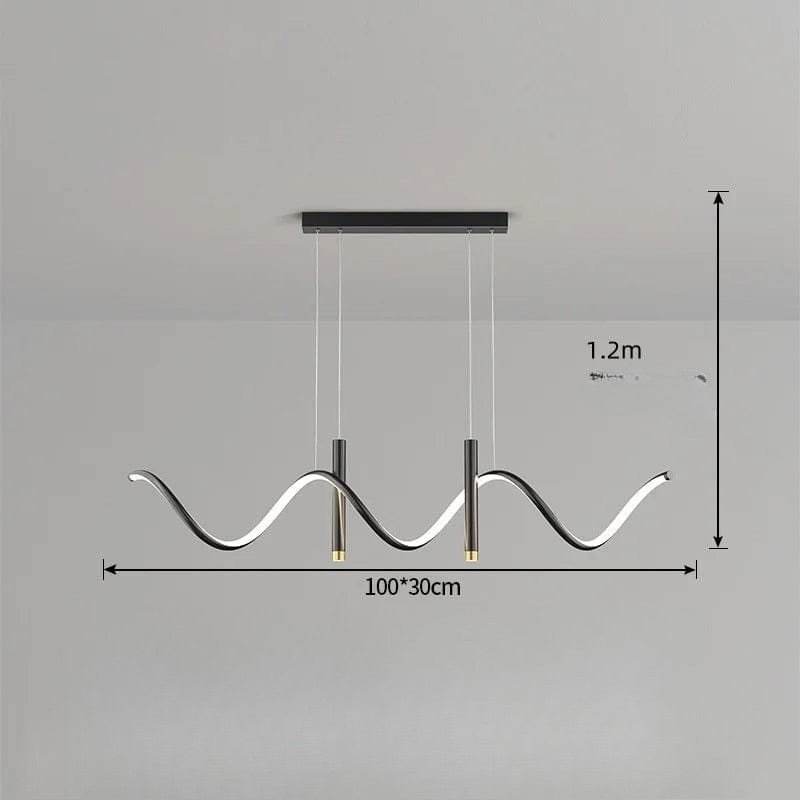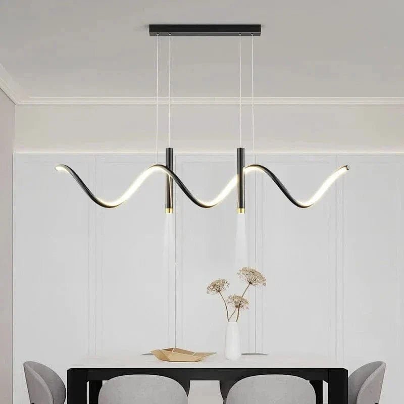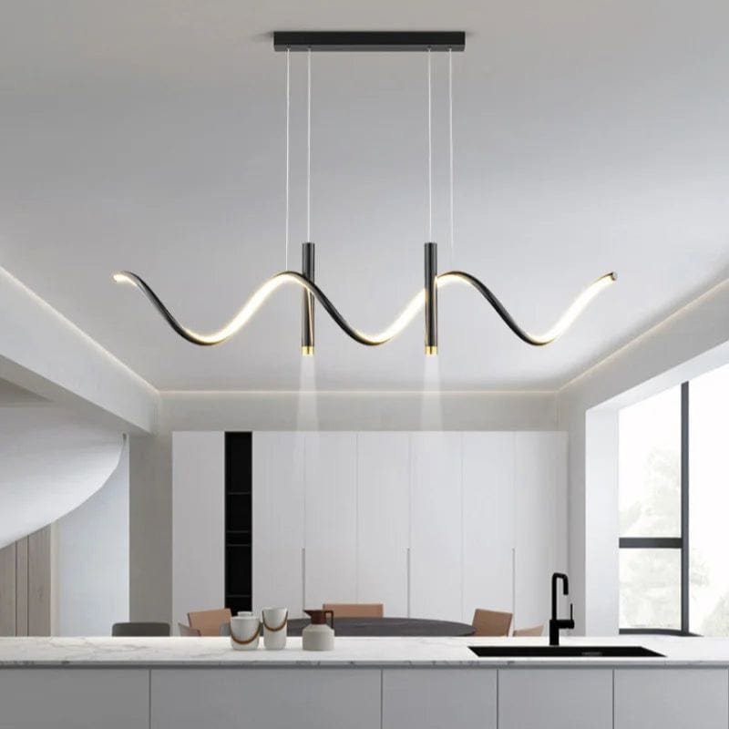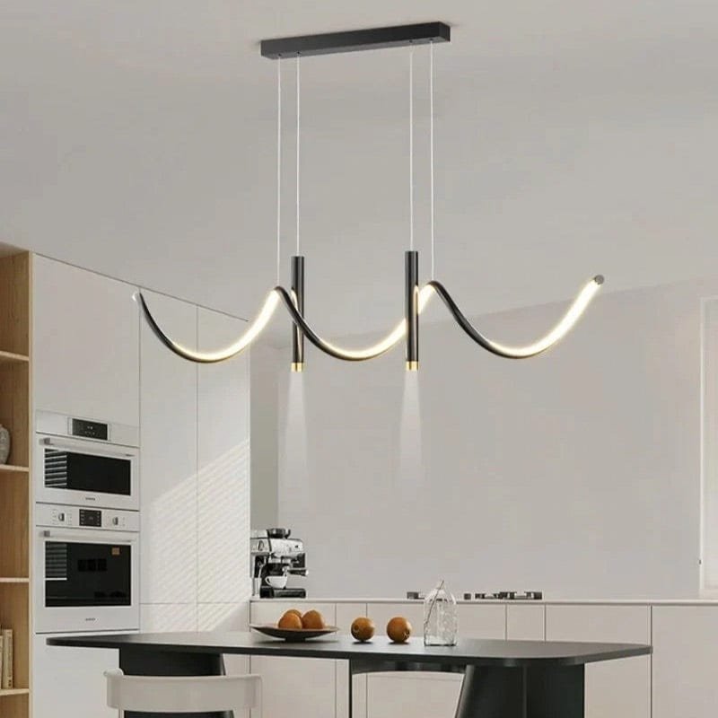 Denna imponerande taklampa kombinerer modern design med lyxiga messingdetaljer för at skapa en stilfull och funktionell ljuskälla. Med sin böljande LED-struktur och minimalistiska svarta metallram bliver den et kunstneriskt indslag över spisebordet, køkkenøen eller i stuen. De integrerede LED-lys giver en varm, jævn glød og bidrager til en behagelig atmosfære, samtidig med at de nedadrettede spotlights giver fokuseret belysning. Den justerbare højde gør det let at tilpasse lampen efter rummets behov.