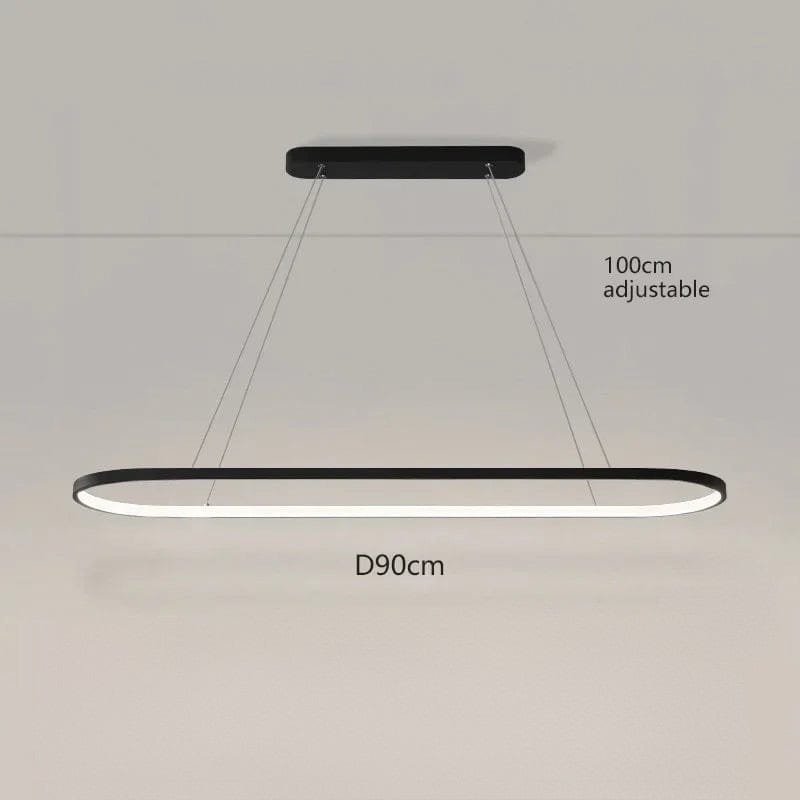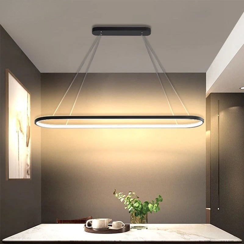 Denne store loftlampe kombinerer minimalistisk design med avanceret LED-teknologi for at skabe en stilfuld og funktionel lyskilde. Med sin ovale, svævende form og tynde metalramme giver den en moderne og luftig følelse, perfekt over spisebordet, køkkenøen eller i stuen. Den indbyggede LED-belysning giver et blødt og behageligt lys med lavt energiforbrug. Takket være den justerbare ophængning kan lampen tilpasses forskellige loftshøjder, hvilket gør den ideel til både store og små rum.