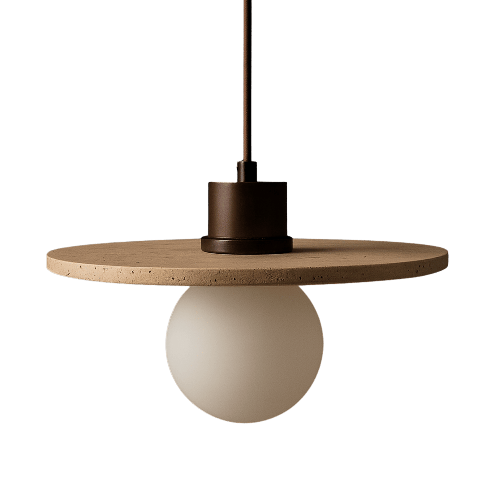 Dette Wabi Sabi-inspirerede loftlys er lavet af naturlig travertin og frostet glas, med en afklædt design, der udtrykker rå skønhed og harmoni. Den tynde, runde stenplade balancerer elegant over den bløde glaskuppel og skaber en subtil, men kraftfuld tilstedeværelse i rummet. Perfekt over et sidebord, i gangen eller som punktbelysning, hvor du vil kombinere funktion med form. Hvert eksemplar har naturlige variationer i stenen – ingen lampe er præcis som en anden.